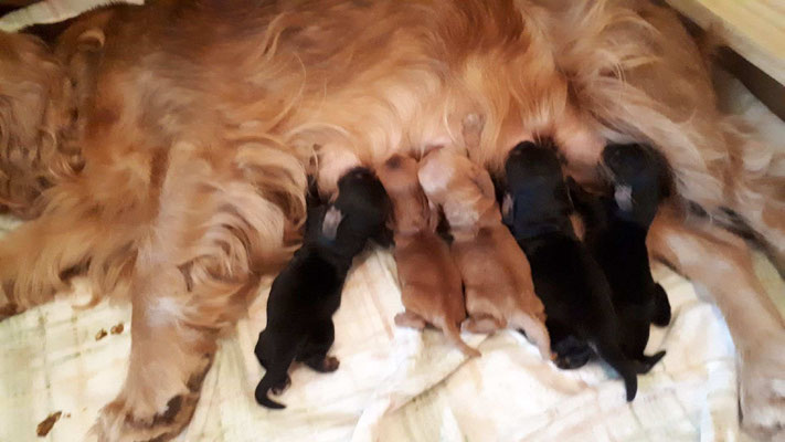 Rüden / 4 Hündinnen rot, schwarz, schwarz mit loh geboren am 28.10.2017 |